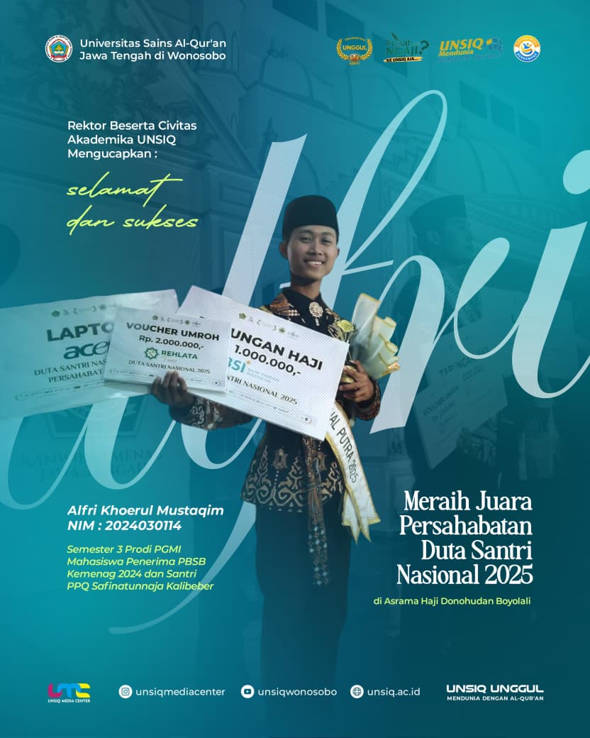 Mahasiswa Fakultas Ilmu Tarbiyah dan Keguruan (FITK) Universitas Sains Al-Qur’an (UNSIQ) Jawa Tengah kembali menorehkan prestasi membanggakan di tingkat nasional. Alfi Khoerul Mustaqim, mahasiswa Program Studi Pendidikan Guru Madrasah Ibtidaiyah (PGMI), berhasil meraih gelar juara dalam ajang Pemilihan Duta Santri Nasional (PILDUSAN) 2025 yang digelar pada 18–26 Oktober 2025 di Solo, Jawa Tengah.