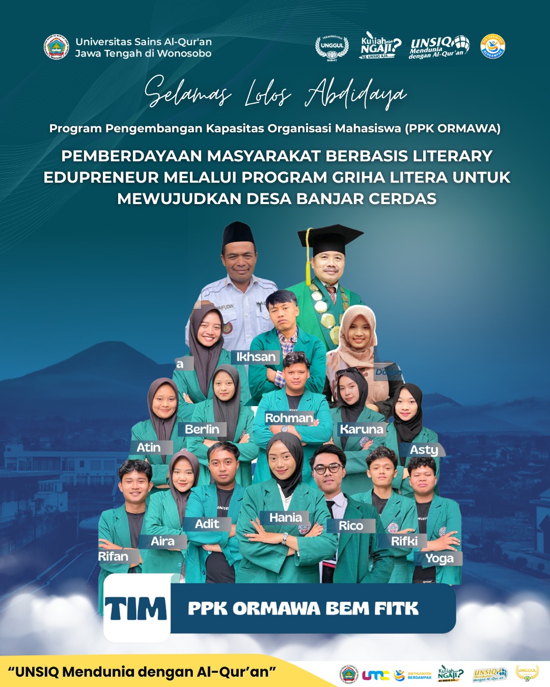 Fakultas Ilmu Tarbiyah dan Keguruan (FITK) Universitas Sains Al-Qur’an (UNSIQ) Jawa Tengah kembali meraih prestasi membanggakan melalui keberhasilan tim PPK Ormawa yang resmi lolos sebagai delegasi Abdidaya Ormawa 2025. Berdasarkan pengumuman resmi peserta Abdidaya Ormawa, tim FITK UNSIQ dinyatakan berhak mengikuti kegiatan tingkat nasional yang akan diselenggarakan pada 4–7 Desember 2025 bertempat di Universitas Muhammadiyah Malang.